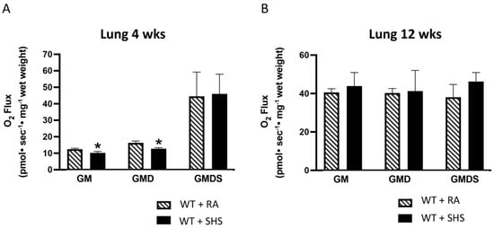 Mitochondrial respiration in lungs from 4- and 12-week-old animals exposed to antenatal secondhand smoke (SHS). To measure mitochondrial respiration, cells were treated with GM, Glutamate (10 mM) + Malate (2 mM), GMD: + ADP (2.5 mM), GMDs, and + Succinate (10 mM). Mitochondrial respiration was significantly decreased in the 4-week-old animals when compared to RA controls (A). No differences in mitochondrial activity were observed in the lungs of 12-week-old animals (B). * Statistically different from control (p < 0.05).