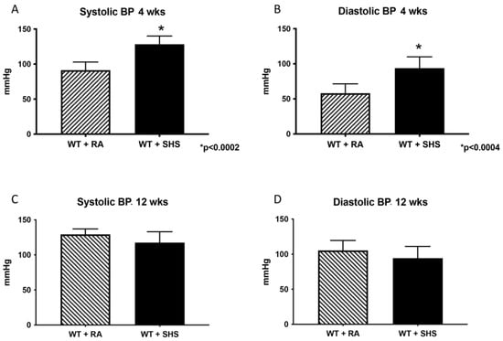 Systolic and diastolic blood pressure in the 4- and 12-week-old animals exposed to antenatal secondhand smoke (SHS). A significant increase in systolic and diastolic blood pressure was observed in the 4-week-old animals exposed to SHS as compared to room air controls (A,B). No differences in blood pressure were observed in 12-week-old animals when compared to controls (C,D). * Statistically different from control (p < 0.05).