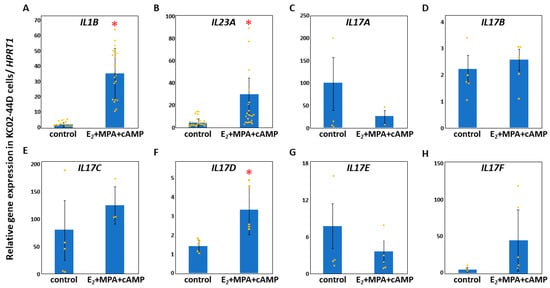 Cytokine expression in KC02-44D cells. Significant increases in IL1B ((A), p < 0.05), IL23A ((B), p < 0.05), and IL17D ((F), p < 0.05) were observed in decidualized KC02-44D cells. No significant differences were noted in IL17A (C), IL17B (D), IL17C (E), IL17E (G), and IL17F (H). * significantly different from control (p < 0.05). HPRT1, hypoxanthine phosphoribosyltransferase 1; E2, estradiol; MPA, medroxyprogesterone acetate; IL, interleukin; IL1B, interleukin 1 beta; IL23A, interleukin 23 subunit alpha.