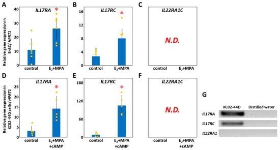 Responsiveness of decidualized endometrial stromal cells (EnSCs) and KC02-44D cells to ILC3-derived cytokines. Significant increases in IL17RA [(A,D), p < 0.05] and IL17RC [(B,E), p < 0.05] and no significant differences in IL22RA1C (C,F) were observed in decidualized EnSCs and KC02-44D cells. * p < 0.05 vs. control using Welch’s t-test. PCR and agarose gel electrophoresis were performed using distilled water as a negative control to confirm their presence or absence, and IL17RA and IL17RC signals were con-firmed to have specific sample-dependent amplifications (G). HPRT1, hypoxanthine phosphoribosyltransferase 1; E2, estradiol; MPA, medroxyprogesterone acetate; IL17RA, interleukin 17 receptor A; IL17RC, interleukin 17 receptor C; IL22RA1, interleukin 22 receptor subunit alpha 1; N.D., no detection.