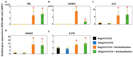 Next, we examined the decidualization markers [53] in decidualized KC02-44D cells treated with 10 ng/mL IL17A. Although IGFBP1 was significantly upregulated in decidualized KC02-44D (p < 0.05), significant suppression of IGFBP1 was observed in the IL17A-stimulated cells compared to levels in decidualized KC02-44D (p < 0.05, Figure 4). Further, significant upregulation of PRL, IL15, HAND2, and IL17D was noted in the decidualized KC02-44D (p < 0.05, Figure 4). There was no effect of additional IL17A stimulation in E2 + MPA+ cAMP-treated cells (Figure 4).