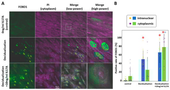 Effect of IL17A on FOXO1 in KC02-44D. The cytoplasm and nucleolus were stained with PI (purple). FOXO1 was fluorescently labeled using a FOXO1 antibody and an Alexa488-secondary antibody (green). The high-power images are magnified versions of the dashed squares in the low-power images (A). Localization in the nucleus or cytoplasm was determined, whereafter the frequency was calculated relative to the number of cells in the entire image covering an area of 1 mm2 (B). * p < 0.05 vs. control using Welch’s t-test with Bonferroni correction. + p < 0.05, vs. decidualization using Welch’s t-test with Bonferroni correction. IL17A, interleukin 17 A; FOXO1, Forkhead box protein O1; PI, propidium iodide.