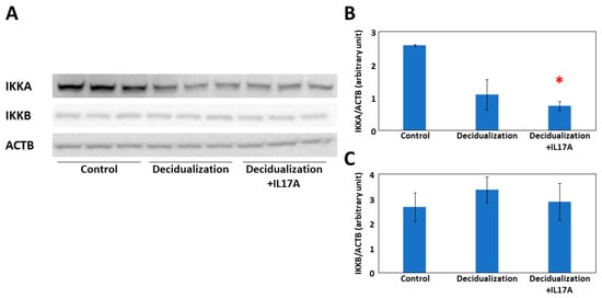To assess changes in the downstream signaling of IL17A, we detected IKKA and IKKB levels in KC02-44D cells after additional stimulation with IL17A. Normalized IKKA band densities were 2.59 ± 0.03 (mean ± SD, control), 1.09 ± 0.46 (decidualization), and 0.75 ± 0.14 (decidualization +IL17A) (Figure 6A). IKKB molecular densities were 0.13 ± 0.03 (control), 0.16 ± 0.02 (decidualization), and 0.16 ± 0.04 (decidualization +IL17A) (Figure 6A). We observed a significant decrease in IKKA (p < 0.05) and no change in IKKB in the IL17A-stimulated cells compared to control levels (Figure 6B).