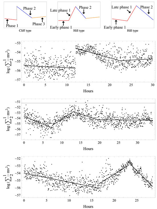 The observation period was divided into appropriate phases as needed in accordance with the change in kinetic energy. The phase period, kinetic energy value, kinetic energy value per hour, and respective regression functions were analyzed to compare the normal and abnormal groups. A regression line was obtained for each phase using the logarithm of the energy value as the dependent variable.