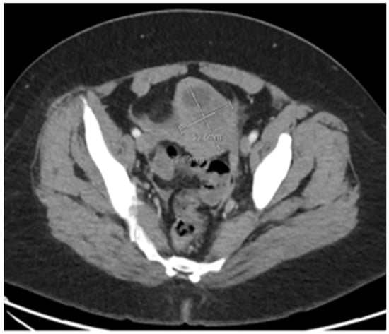 A 42-year-old G2P1011 patient with a past medical history of complete hysterectomy presented to the Emergency Department with 2 days of diffuse and worsening abdominal pain, constipation, nausea, and vomiting. Her prior surgical history is noteworthy for a prior cesarean delivery and a total laparoscopic hysterectomy. When interrogated, however, the patient reported that she was unsure if she had had a total versus a supracervical hysterectomy. The patient had normal vital signs, a diffusely tender abdomen, and leukocytosis with a left shift. A CT abdomen and pelvis with contrast test was performed, which was significant for features consistent with a ruptured appendicitis (Figure 1), as well as the “uterine remnant” (Figure 2) mentioned on the initial radiographical reading. The initial radiology reading did not consider the patient history of hysterectomy and described a 5.3 × 7.7 cm gynecological organ thought to be characteristic of a distended endometrial cavity or uterine remnant with low attenuating fluid collection. Additionally, no ovaries were noted on the initial read, and no additional findings were reported except small amounts of adjacent free fluid. In the setting of an acutely painful patient with radiologic findings consistent with appendicitis and no initial suspicion of an acute gynecological pathology, the ED provider consulted general surgery, who took this patient to the OR without the gynecology team being consulted.