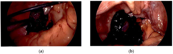 During the procedure, the appendix was visualized and found to be significantly inflamed, although no perforations were immediately noted. When visualizing the pelvis, the general surgery team appreciated 200 cc of well-formed clot adjacent to a left adnexal hemorrhagic mass (Figure 3a,b). The night gynecology team was consulted intraoperatively after the appendix was removed and while the primary surgical team was finishing their case. The initial gynecological team appreciated a clot covered adnexal mass, but upon the suction and manipulation of the area, an overall hemostatic, stable, and non-necrotic ovary was appreciated. Consideration was given to possible oophorectomy; however, given the borderline findings intraoperatively and the lack of consent for additional procedures such as an oophorectomy, the case was closed without further interventions.