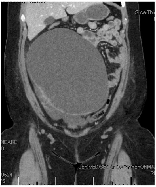 Patient 1: CT abdomen and pelvis with intravenous administration of contrast agent at initial presentation, showing a 21.2 × 13.9 × 24.1 cm complex adnexal mass.