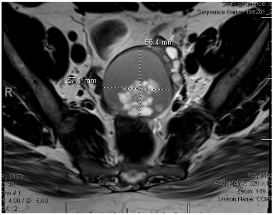 She was followed closely by gynecologic oncology with surveillance visits, transabdominal pelvic ultrasounds, and CA125 levels every 6 months. She was diagnosed with recurrent disease 26 months after her initial surgery when an enlarging left adnexal cyst was found on pelvic ultrasound. Additional magnetic resonance imaging (MRI) showed a 5 cm mass in the left ovary with an internal solid component (Figure 2), CA125 was normal at 16 IU/mL. Discussion of cystectomy versus salpingo-oophorectomy was had with the patient, and, given the risk of recurrence with cystectomy, she opted to undergo laparoscopic left salpingo-oophorectomy, uterine preservation, and peritoneal nodule biopsy, with final pathology confirming recurrent serous BOT with a non-invasive peritoneal implant. She has continued on surveillance and has been without evidence of disease recurrence for 24 months.