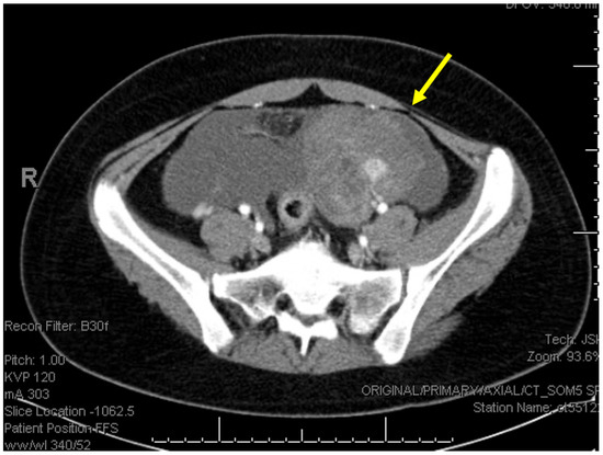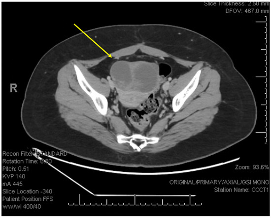She presented to the ED again at the age of 16, 21 months from her most recent surgery, with acute onset abdominal pain. CT scan demonstrated a 11.0 × 6.6 × 6.3 cm right adnexal mass (Figure 4), and the decision was made to proceed with surgical management. Intraoperative findings were notable for an 8 cm right multilobulated cystic ovarian mass and normal appear ovarian stroma, cystic right fallopian tube, normal uterus, and surgically absent left adnexa. Her procedure included a laparoscopic right salpingo-oophorectomy. There was no spillage of cystic contents or residual disease at the end of the case. Final pathology confirmed recurrent serous BOT. She has been in follow-up for 24 months without any evidence of recurrent disease.