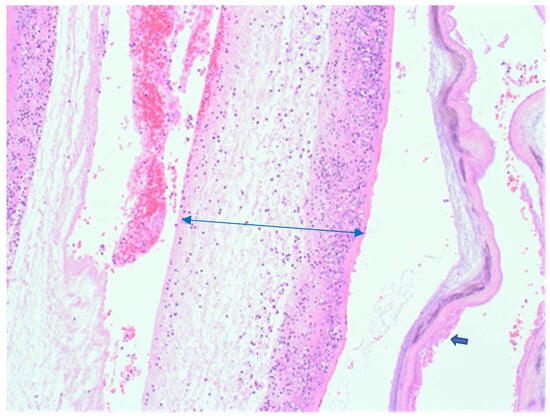 Haematoxylin & Eosin (100×). Membranes showing transmural acute inflammation (chorioamnionitis)—double headed blue arrow, with clusters of Actinomyces colonies on the surface of a strip of membrane right (thick blue arrow).