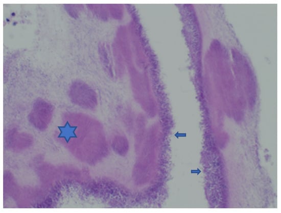 Periodic Acid Schiff (200×). Membrane containing colonies of Actinomyces organism (thick blue arrow) and multiple aggregates of Splendore–Hoeppli granules (Blue star).