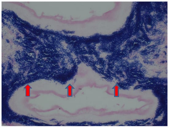 Gram stain (400×) showing dense aggregates of Gram-positive organisms representing Actinomyces spp. (red arrows) in the placental membranes.