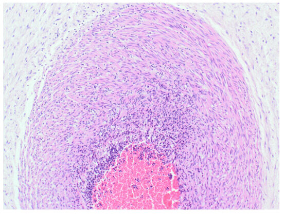 Haematoxylin & Eosin (200×). Part of the cross section of the umbilical cord, showing transmural acute inflammatory cell infiltration of the vessel wall consistent with funisitis.
