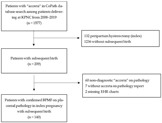 From 1 January 2008 to 31 December 2019, we identified a cohort of 140 patients with confirmed BPMF in the index pregnancy who had a subsequent birth. This number was derived from an initial pool of 1577 patients that resulted from the CoPath database search for “accreta” in the pathology reports. We identified 209 patients who went on to have a subsequent birth of a singleton. Among the 69 excluded from the final cohort, 60 had “non-diagnostic” BPMF findings in the pathology report, 7 did not have BPMF, and 2 had missing charts (Figure 1).