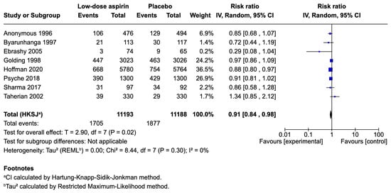 Eight [18,25,26,27,28,29,31,32] studies, with 22,381 participants, were included in the pooled analysis. The Bakhti [30] study was excluded from the analyses for high risk of performance bias. Aspirin-treated women had a 9% reduced risk of delivering prematurely (RR 0.91; 95% CI 0.84 to 0.98; p = 0.02). Heterogeneity was low, I2 = 0%. The results are presented in Figure 2.