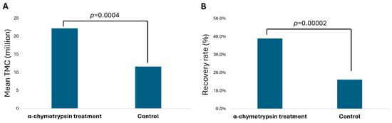 A total of 35 liquefied semen samples were equally divided into an experimental group (treatment with α-chymotrypsin) and a control group followed by sperm preparation by the gradient method. Then, TMC and sperm recovery rate were measured for both groups. TMC was significantly increased in the α-chymotrypsin treatment group (22.2 million vs. 11.6 million, p = 0.0004) and the average recovery rate of motile sperm was significantly higher in the α-chymotrypsin-treated group (38.9% vs. 16.2%, p = 0.00002), as seen in Figure 1.