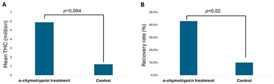 In the sub-analysis of patients (n = 8) with severely low sperm count, which was defined as TMC of less than 10 million, there was a significant improvement in TMC (5.89 million vs. 1.21 million, p = 0.004) and the rate of recovery (43.0% vs. 10.0%, p = 0.02) in the α-chymotrypsin-treated group, as seen in Figure 2.