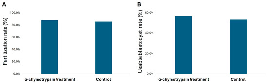 Fertilization rate (A) and usable blastocyst rate (B) in IVF cycle of α-chymotrypsin-treated sperm.