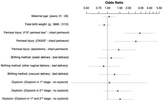 Data were analyzed using the statistical software R, Version 4.4 []. Univariable statistics are presented as counts and frequencies for categorical data with p-values of odds ratios (ORs) corresponding to the chi-squared test. Multivariable logistic regression was performed to estimate ORs and corresponding 95% confidence intervals (CIs) using the rms package. Numeric variables like maternal age and birth weight were modeled non-linear using three-knot restricted cubic splines (rcs) []. The selection of covariates included in the model was guided by a combination of clinically relevant considerations and variables associated with the outcome in univariable analyses. The final model contained the following variables to adjust for potential confounders: maternal age, fetal birth weight, perineal injuries, birthing methods, and the use of oxytocin. A p-value < 0.05 was considered significant with a 95% confidence interval.
