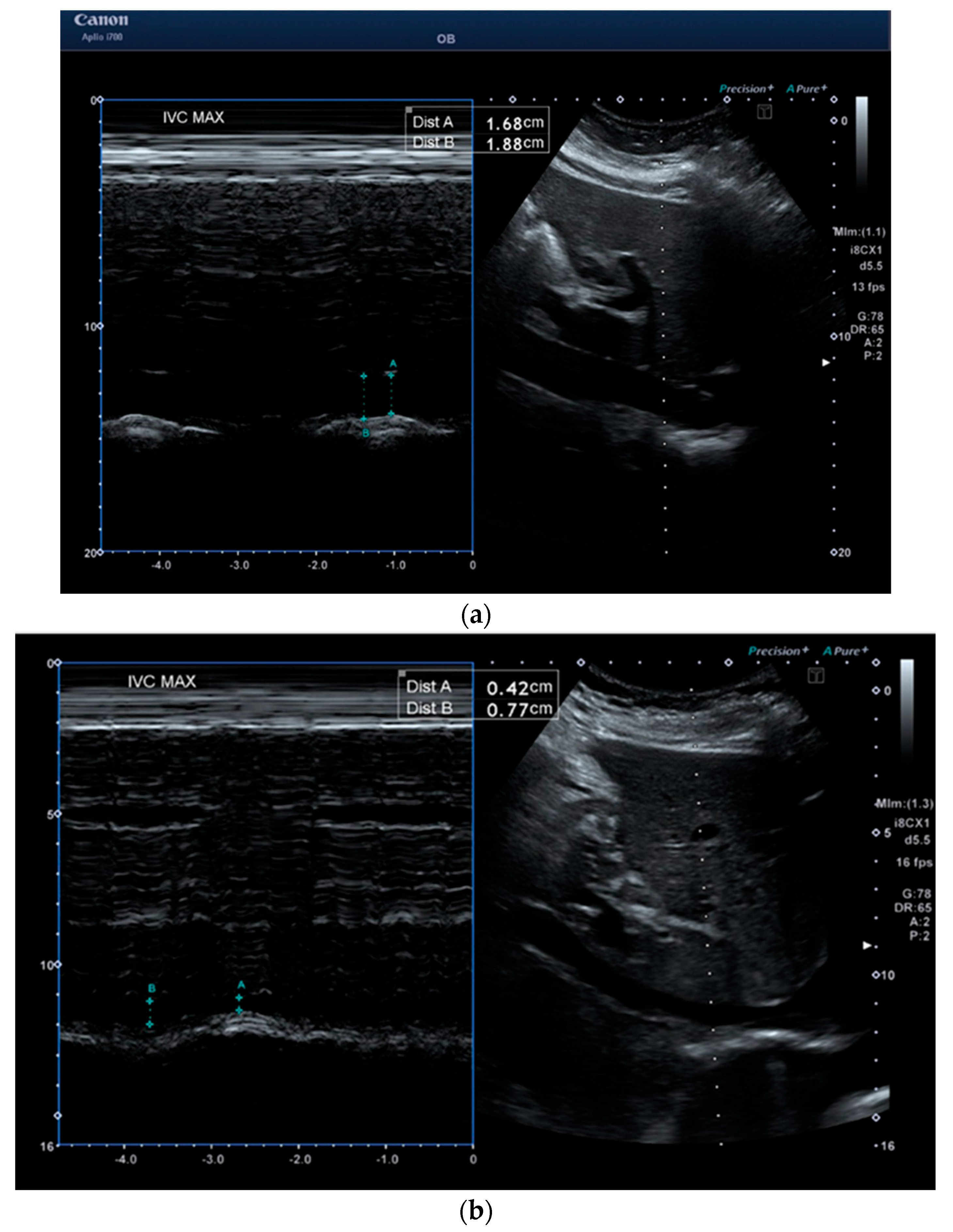 - Chong, Y.; Yu, Y.; Zhao, Y.; Zhang, Y. Value of inferior vena cava diameter and inferior vena cava collapse index in the evaluation of peripartum volume: A prospective cohort study. Eur. J. Obstet. Gynecol. Reprod. Biol. 2023, 285, 69–73. [Google Scholar] [CrossRef] [PubMed]