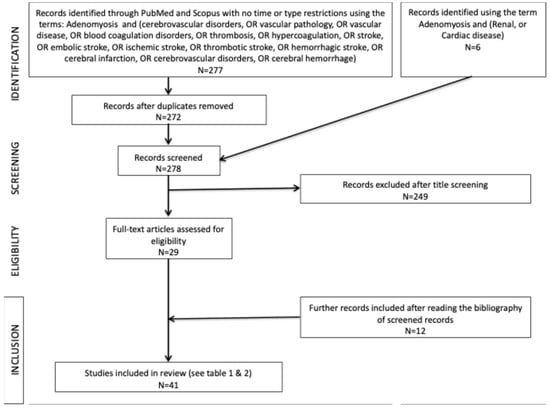 During July 2024, a literature search was carried out using the electronic databases PubMed, MEDLINE and Scopus. The following terms were used in the search: [Adenomyosis AND (cerebrovascular disorders OR vascular pathology, OR vascular disease, OR blood coagulation disorders, OR thrombosis, OR hypercoagulation, OR stroke, OR embolic stroke, OR ischemic stroke, OR thrombotic stroke, OR hemorrhagic stroke, OR cerebral infarction, OR cerebrovascular disorders, OR cerebral hemorrhage)].
