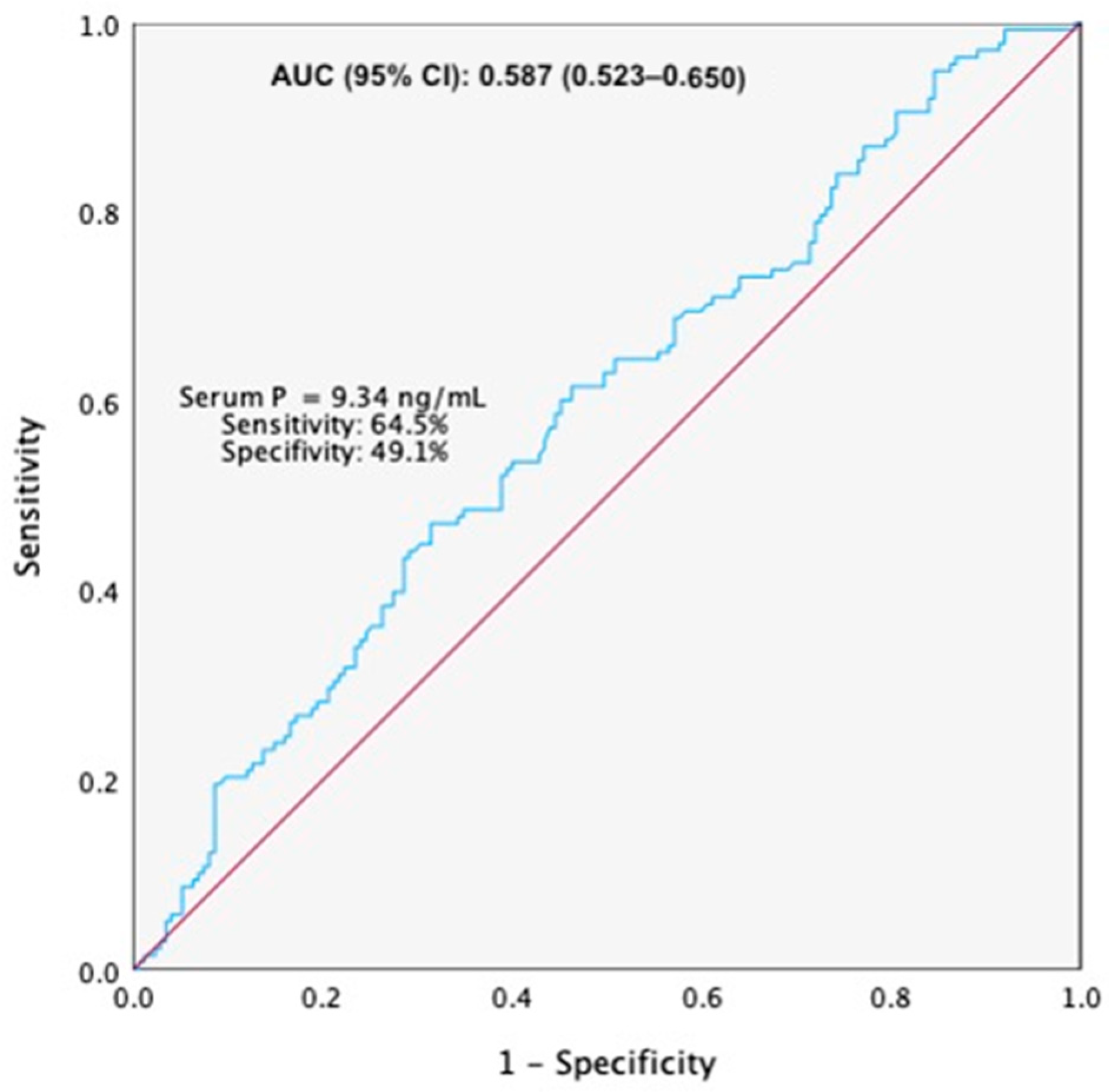 Figure 2). The optimal cut-off value for predicting CPR was a serum P level of 9.34 ng/mL, corresponding to a sensitivity of 64.5% and a specificity of 49.1%.