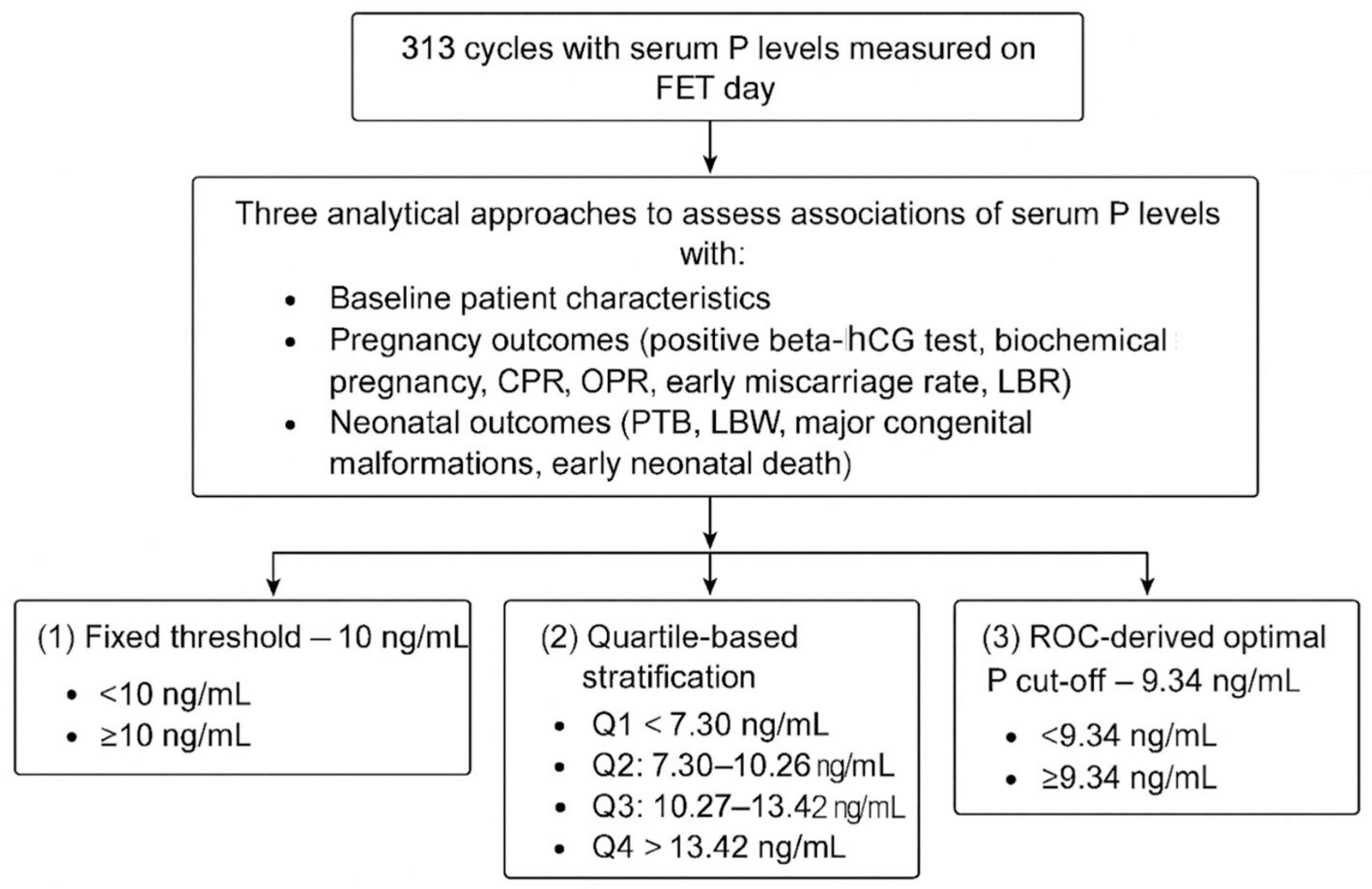 A schematic conceptual model illustrating the three analytical strategies used to evaluate the association between serum P levels on the day of FET and baseline characteristics and reproductive outcomes is presented in
