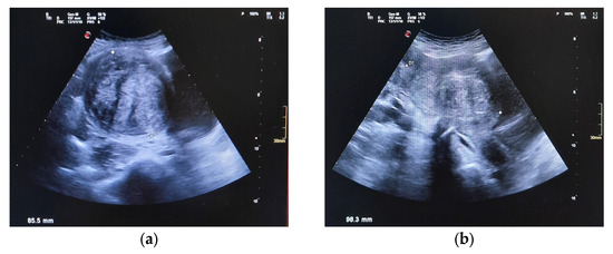 On 27 December 2024, an abdominal ultrasound performed at Parini Hospital (Aosta, Italy) identified a large pelvic solid mass (~9 cm maximum longitudinal diameter) (Figure 1), with a heterogeneous appearance, predominantly peripheral vascularization, and multinodular morphology, likely of uterine origin (fundal). Urgent gynecologic evaluation was recommended. Table 2 presents a timeline of the patient’s clinical course.