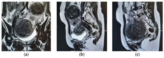 MRI images in coronal (a) and sagittal (b,c) planes. The images demonstrate the patient’s pelvis, almost completely deformed due to the mass effect of the fibroids, with the cranial one measuring 67 × 60 × 67.5 cm and the caudal one 92.5 × 91 × 84 cm.