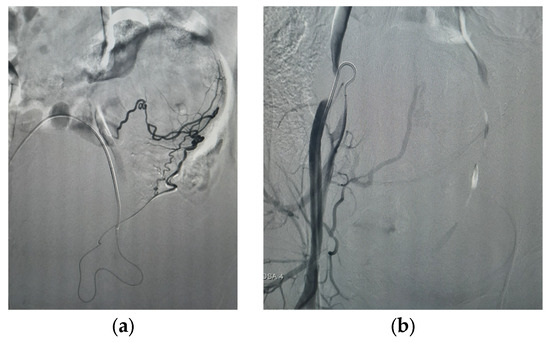 On 5 June 2025, the patient underwent selective PUAE at Parini Hospital (Figure 3). Via right femoral access, angiography showed marked hypervascularization of both myomas, especially of the most cranial one. Both uterine arteries were embolized with 800-micron non-absorbable particles followed by gelfoam emulsion. At the end of the procedure, adequate devascularization of both lesions was observed. Beyond their application in the treatment of uterine fibroids, the embolic agents used during PUAE—including gelfoam—are also widely employed in the management of other gynecologic vascular pathologies. In particular, gelfoam slurry has demonstrated efficacy in controlling bleeding from uterine and pelvic pseudoaneurysms and has been used as part of conservative treatment strategies for cervical and select non-tubal ectopic pregnancies, where prompt devascularization is essential to avoid major hemorrhage.