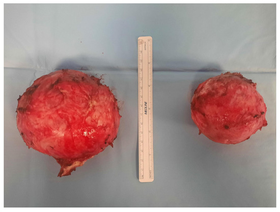 On the same day at Beauregard Hospital, the patient underwent a longitudinal laparotomic multiple myomectomy, with bilateral occlusion of the uterine and the utero-ovarian vessels using vascular clamps (maintained for roughly one hour). Upon opening the abdominal cavity, the uterus was immediately visualized as enlarged and deformed by the presence of multiple fibroids, primarily by the two dominant ones previously identified through preoperative diagnostic imaging. The procedure lasted about 85 min, with both fibroids successfully excised without complications (Figure 4). A double-layer uterine closure was performed, with the second layer being imbricating, using an absorbable monofilament suture USP 0 with a 32 mm curved needle. Although two units of blood products were requested preoperatively, no transfusions were administered, as blood loss was limited (approximately 100 cc).