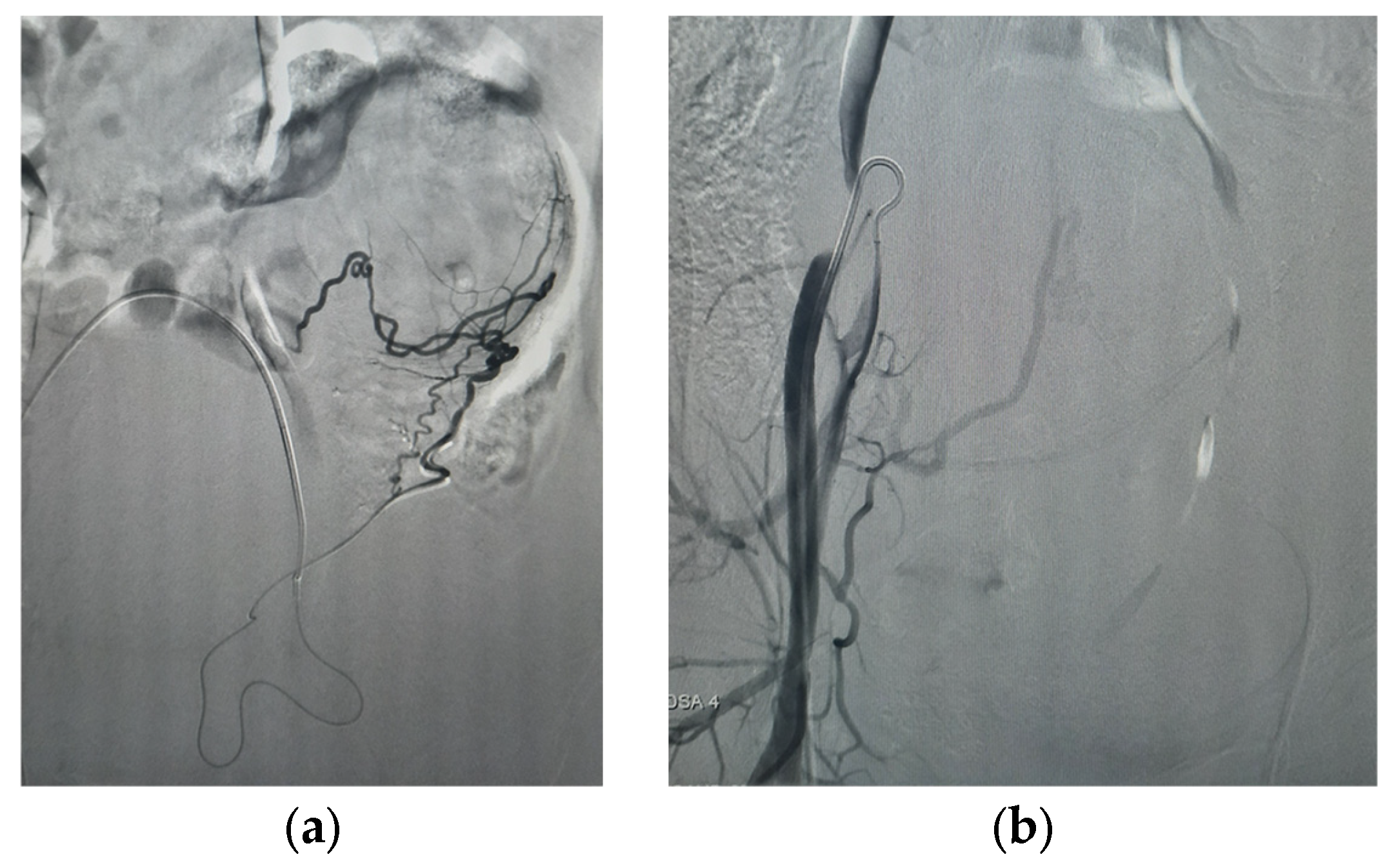 - Hiraga, H.; Hoshino, K.; Yokoyama, E.; Takahashi, Y.; Sato, T.; Takahashi, Y.; Toratani, J.; Kuga, A.; Takahashi, A.; Watanabe, Z.; et al. Fertility Complications After Uterine Artery Embolization for Postpartum Hemorrhage: A Case of Infertility and Miscarriage Following Stillbirth. Cureus 2025, 17, e82609. [Google Scholar] [CrossRef]