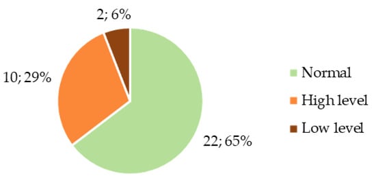 Normal AMH levels (4–6.8 ng/mL) were found in 5 (15%) participants, the lower threshold of normal (2.2–4 ng/mL) in 7 (21%), low (0.3–2.2 ng/mL) in 9 (26%), very low (<0.3 ng/mL) in 10 (29%), and high (>6.8 ng/mL) in 3 (9%) (Figure 5).
