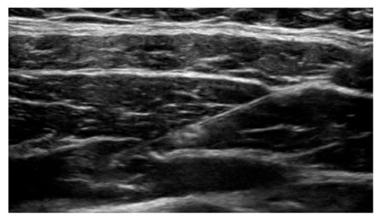 The ultrasound image depicts a 21-gauge, 4 inch needle containing liposomal bupivacaine in the transversus abdominis plane adjacent to the nerve plexus.