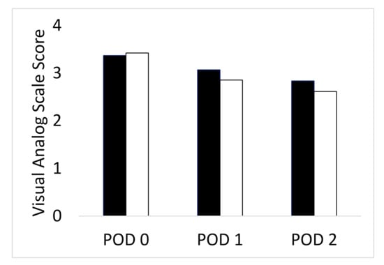 Average pain score on each post-operative day. Black bars = patient controlled analgesia; white bars = transversus abdominis plane block; POD = post-operative day.