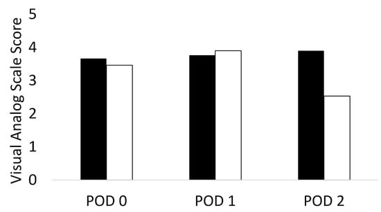 Variance in pain score on each post-operative day. Black bars = patient controlled analgesia; white bars = transversus abdominis plane block; POD = post-operative day.