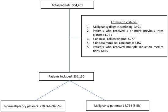 Of the total 304,451 patients, 231,130 patients were included. We excluded patients who received a transplant prior to the year 2000, missing diagnosis of malignancy, patients who received at least one previous solid organ transplant, patients who suffered only nonmelanoma skin cancers and patients who received multiple induction medications (Figure 1).