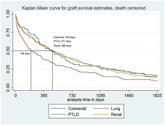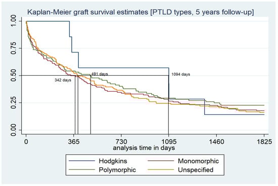 Among the patients who suffered PTLD, 49 (2.5%) patients had Hodgkin’s lymphoma, and 8/49 (16.3%) suffered graft failure, with a median graft survival time of 1094 (349–1368) days. Similarly, 666 (37.3%) suffered from monomorphic PTLD, and 124 (18.6%) failed their graft, with a median graft survival time of 306 (59–1091) days. A total of 421 (24.2%) patients suffered polymorphic PTLD, and 91 (21.6%) patients failed their graft during the 5-year follow-up. The median graft survival time among the patients who suffered polymorphic PTLD was 422 (55–1379) days. The remaining 800 patients had unspecified PTLD, and 158 (19.8%) patients failed their graft. The median graft survival time among them was 395 (93–998) days (Table 3, Figure 4). The lowest graft failure rate with the highest median graft survival time was noticed among patients with Hodgkin’s lymphoma type PTLD.