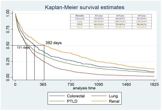 Among the 12,764 patients who suffered malignancy in the cohort, 4961 patients had either colorectal, lung, PTLD, or renal malignancy. Of the 12,764 patients, 494 (3.9%) were diagnosed with colorectal malignancy, 1416 (11.1%) recipients suffered lung malignancy, 1936 (15.2%) patients were diagnosed with PTLD, and renal malignancy was diagnosed in 1115 (8.7%) patients during the follow-up period. The median time to diagnosis of malignancy was 1853 (952–2970) days (5.1 years) for colorectal malignancy, 1731 (888–2715) days (4.7 years) for lung malignancy, 1081 (343–2332) days (2.9 years) for PTLD, and 1271 (519–2471) days (3.5 years) for renal malignancy. Among the patients who suffered renal cell carcinoma, 894 (80.2%) were on dialysis during pretransplant, and 188 (16.8%) had a preemptive transplant. The median dialysis vintage time was 1105 (545–2000) days.