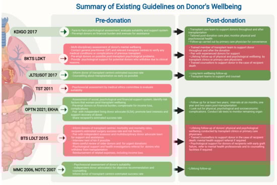 With increasing recognition of living donor well-being, several transplant societies have crafted recommendations on pre-donation assessment, surgical and post-donation care plans for living donors (Figure 1). The majority of the clinical guidelines recommend pre-transplant psychosocial assessment of potential donors to ensure psychological fitness and prevent coercion [35,36,37,38,39,40]. Similarly, most societies emphasize the importance of integrating donors into transplant care teams which serve as supportive networks [37,38,41]. Another key recommendation is to improve communication of physicians during pre-transplant workup to help donors set realistic expectations of graft success rates and make informed decisions [36,42,43]. Some guidelines further suggest for donors to be paired with advocate(s) who will promote their best interests [35,36,43] while others encourage financial counselling [35,36,38].