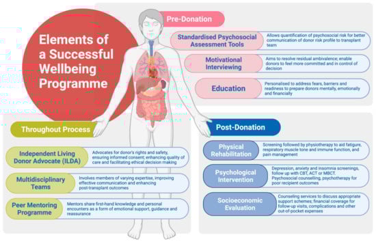Financial Support. The implementation of a comprehensive transplant program for donors is dependent on the availability of financial resources. Therefore, long-term financial support sourced from various stakeholders [86] in addition to health grants and donor contributions are vital for institutions to acquire. Private centres may also seek to establish contracts with governmental institutions to enhance their donor care program [48]. Ideally, financial coverage for donors should include transport costs for follow-up visits [35], medical complications of transplantation [87] and other out-of-pocket expenses [88]. Given that donation-related financial costs contribute to post-transplant anxiety and distress for donors, the establishment of a reliable financial safety net is warranted to ensure transplant centres can manage donors’ socioeconomic concerns and overall wellbeing.