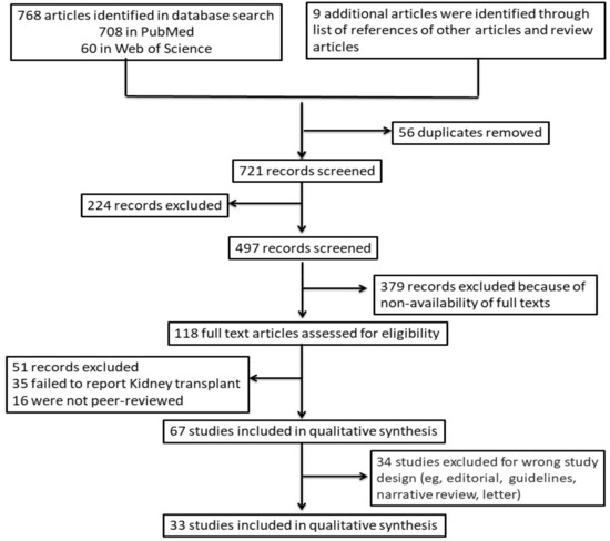 A systematic literature search of the articles indexed in the PubMed and Web of Science databases was performed to obtain relevant studies. The search was conducted as of 24 May 2021 without any language restriction. The terms used for search included “COVID-19”, “SARS-CoV-2”, “kidney transplant” and “chronic kidney disease”. Relevant literature reviews and references of included studies were also searched to spot other relevant analyses. This review was conducted in accordance with preferred reporting items for systematic and meta-analysis (PRISMA) guidelines. The full search strategy is depicted in Figure 1.