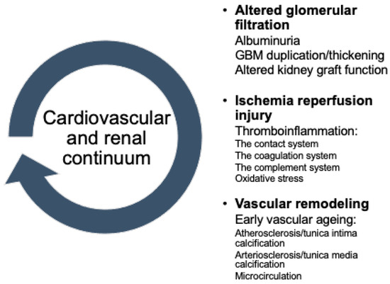 There is enough evidence supporting the fact that left ventricular function and left ventricular hypertrophy improves after kidney transplantation [9]. However, the impairment of the vascular structure after kidney transplantation remains unchanged and might even worsen [10,11]. The pathophysiological mechanisms behind vascular remodeling observed in the posttransplant period include atherosclerosis, arteriosclerosis, and cardiorenal syndrome. For example, activation of the complement system [12,13,14,15], low-grade inflammation [2], and structural and functional changes of the glomerular filtration barrier [3] (Figure 1) are the hallmarks of posttransplant changes in the cardiovascular and renal continuum. We aim to critically review pathways that might help to better understand pathophysiological mechanisms and develop new treatment options for improving cardiovascular health after kidney transplantation.