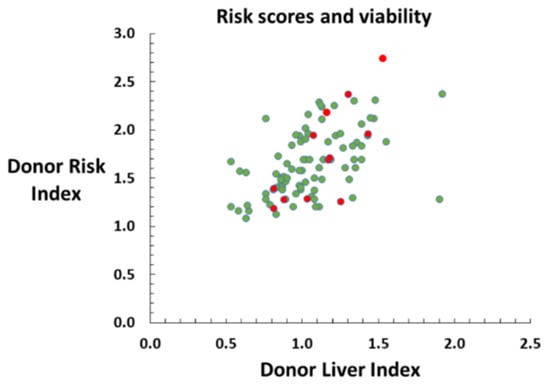 Normothermic machine perfusion viability assessment of 100 liver grafts from deceased brain-dead donors with the intent to transplant. Scatter plot demonstrating relationship between DRI and DLI for viable (green) and non-viable grafts (red). Non-viable grafts are distributed across a range of donor risk score values, and do not appear to cluster.