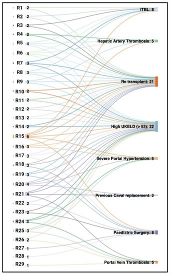 Sankey diagram explaining the accumulated risk factors of high-risk recipients. Early Birmingham experience in the initial cohort of 29 consecutive high-risk patients transplanted with NMP-preserved grafts. Several high-risk features frequently coexist in one recipient. This diagram demonstrates that the majority of patients have two or more of these characteristics, making them technically challenging recipients. R, recipient number followed by cumulative risk factors (for example, R18 3 denotes recipient 18 had three high-risk factors); ITBL, ischaemic-type biliary lesions; UKELD, United Kingdom model for end-stage liver disease.