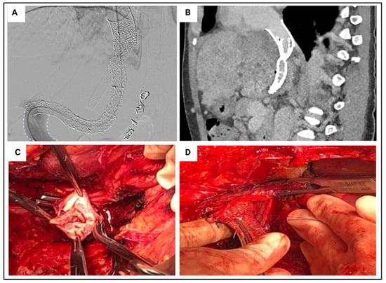 Budd–Chiari syndrome case example. Recipient: 45 year old female with Budd-Chiari syndrome secondary to Jak2 mutation. Previously managed with two hepatic vein stents, multiple venoplasties and a transjugular intrahepatic portosystemic shunt (Panel (A,B)). Listed due to progressive liver disease (UKELD 57). Graft: 71 year old deceased brain death donor. Coeliac trunk stenosis identified at time of retrieval. Normal arterial anatomy. Cold ischaemic time of 7 h 13 min, normothermic machine perfusion time of 8 h 18 min. Operation: Retrohepatic inferior vena cava (IVC) thrombosed, requiring eversion thrombectomy (Panel (C)). Hepatic vein stent adherand to suprahepatic IVC (Panel (D)). Graft implanted via caval replacement technique. Post-operative recovery: Immediate graft function. Peak ALT 102 IU/L on post operative day 2. Intensive care unit stay of 3 days, discharged from hospital on post-operative day 11. Therapeutic level anticoagulation commenced on post-operative day 4.