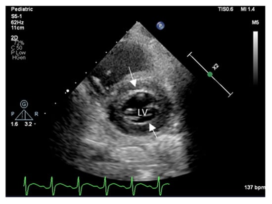 Two-Dimensional echocardiography shows a short axis of LV with increased wall thickness due to edema and inflammation immediately after heart transplantation; arrows point to thickened interventricular sept, and LV posterior wall thickness increased (z score + 2).