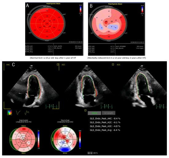 Left ventricle ejection fraction (LVEF) and fractional shortening (LVFS) are standard methods of quantifying LV systolic function. However, after HT, altered geometry of ventricles, resting tachycardia, and abnormal septal motion occur, making standard echocardiography less sensitive to detect early dysfunction, rejection, or CAV. Strain and strain rate analysis allows quantifying myocardial function at the regional level. STE is a more precise method for quantifying LV function in pediatrics, with lower variability than LVEF and LVFS []. Calculating strain and strain rate by 2-D STE in children has also been shown to correlate with LVEDP [,,]. Global longitudinal strain (GLS) is the most common strain analysis used in pediatric HT recipients. Several small studies found that noninvasive GLS is sensitive and specific in identifying acute clinical rejection in pediatric HT recipients [,,,,]. Speckle tracking strain and strain rate imaging were also helpful in defining low-grade rejection in children after HT []. GLS by speckle tracking echocardiography imaging correlates better with invasive measurement of LVEDP than traditional echocardiographic parameters [,]. The STE strain imaging is also valuable for detecting the early development of CAV in children after HT []. An example of 2-D speckle tracking imagine differentiating no-rejection versus chronic rejection in a pediatric HT recipient is shown in Figure 3A–C. The advantage of STE is higher spatial resolution and is angle independent. The disadvantages are similar to TDI, no normal values are established in pediatric HT recipients, and there is a learning curve for this modality among technicians and physicians.