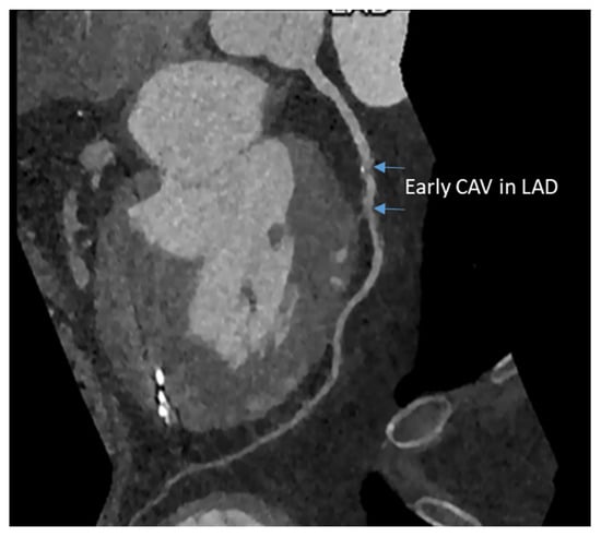 CT coronary angiography (CTCA) has higher sensitivity and specificity for diagnosing CAV compared to stress echocardiography. It has been used in adults for routine detection of CVA with good image quality and low radiation dose []. With photon-counting CT, we are entering a new era that decreases radiation dose and less need for a contrast agent for CTCA to detect CAV early in the disease process []. The advantage of CTCA is that it is accessible in most centers, has a relatively low cost compared to MRI, and has high-resolution images. In addition, based on CTCA, 2010 ISHLT has decreased the stenosis of coronary to 50% rather previous 70% for early diagnosis of CAV []. The disadvantages are radiation exposure; contrast cannot be used with renal dysfunction and does not give any information on coronary microvasculature. CTCA is considered a gatekeeper for coronary angiography. An example of early detection of CAV in an 18-year-old HT recipient is shown in Figure 4. However, using CTCA in younger HT recipients has been challenging because of their high heart rate, small vessel size, and inability to lie still or hold their breath.