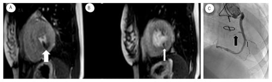 (A,B) MRI Perfusion images showing inferior ischemia induced by Adenosine (white arrow) in a patient with known CAV (C) Black arrows showing stenosis on selective coronary angiogram.